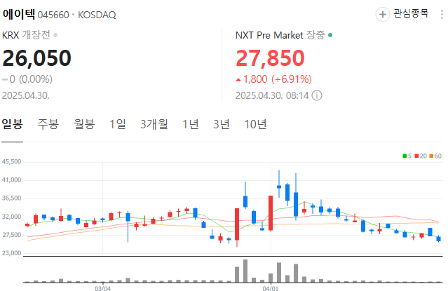 | 에이텍 | 26,050원 | 46,300원 | 11,420원 | 하락세 | 정치 이슈 반영 |