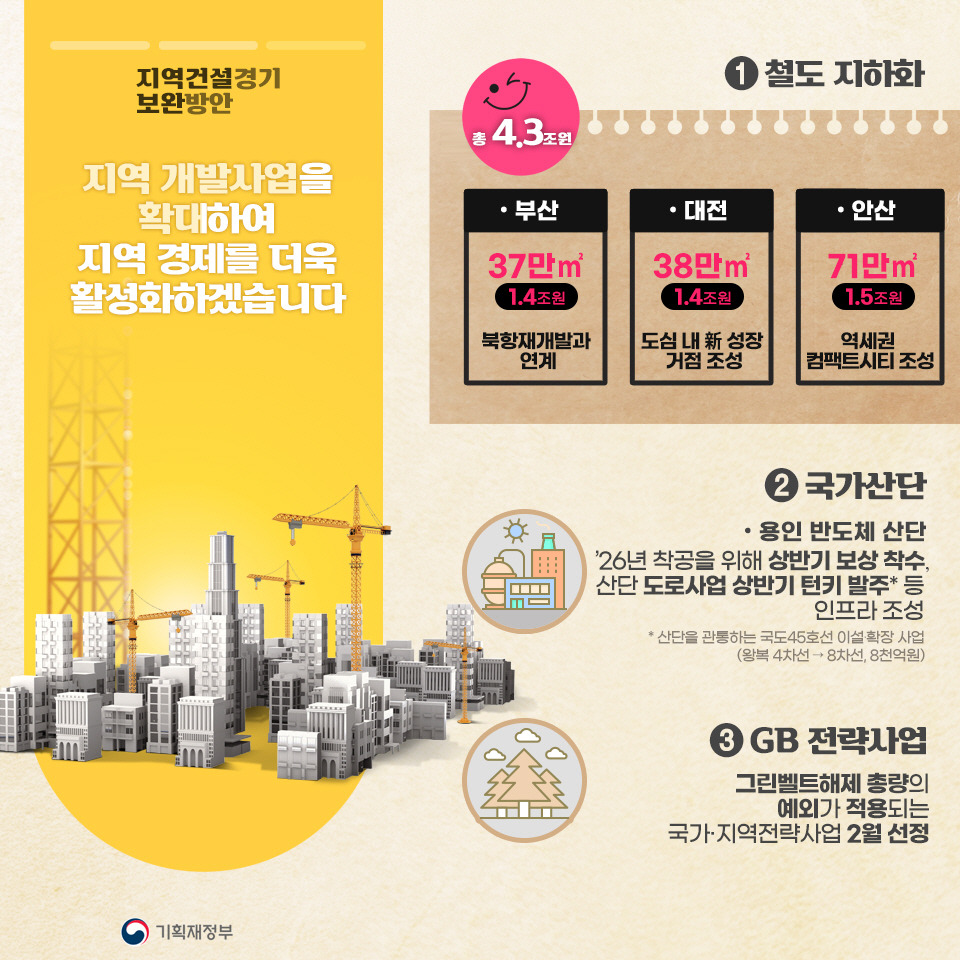- 철도 지하화 프로젝트: 부산, 대전, 안산 등지의 철도 지하화를 추진하며, 총 4.3조 원이 투자됩니다.