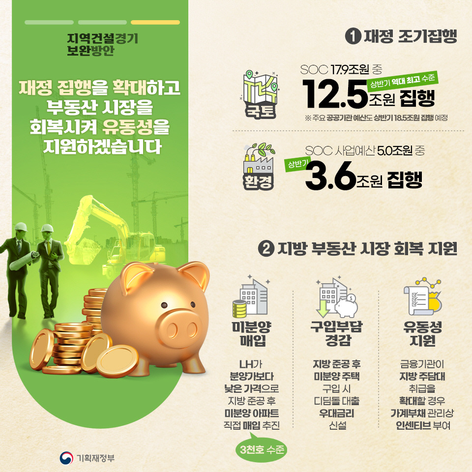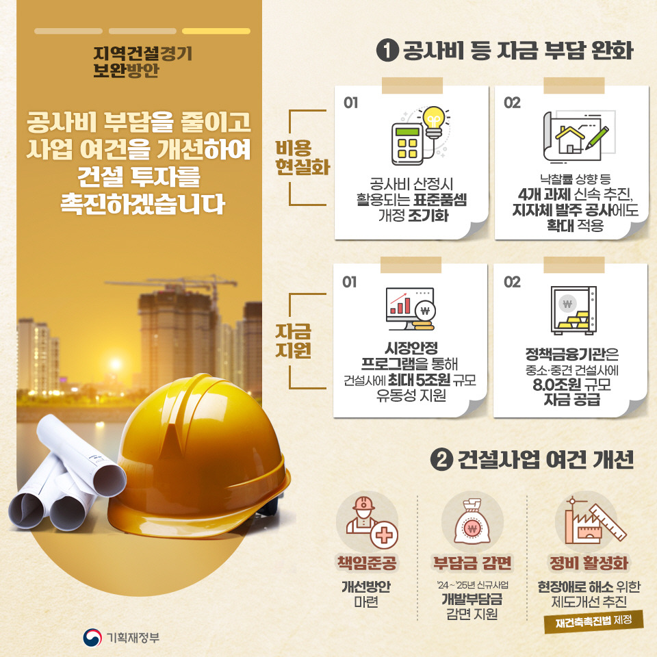 최근 기획재정부는 지역 건설경기 활성화와 내수 진작을 위한 '지역 건설경기 보완방안'을 발표했습니다. 이번 방안은 지역 개발사업 확대, 재정 조기 집행, 부동산 시장 회복 지원, 공사비 부담 완화 등 다양한 전략을 포함하고 있습니다.