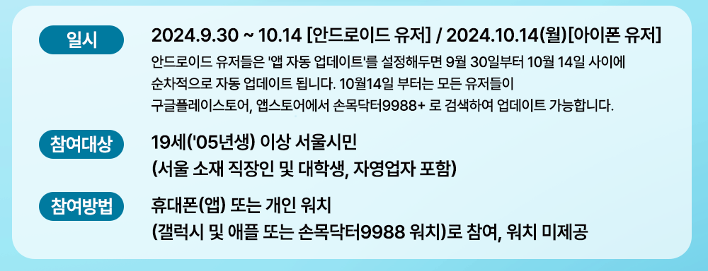 서울시는 시민들의 건강 증진과 활기찬 삶을 위해 ‘손목닥터9988+’라는 스마트 헬스케어 애플리케이션을 운영하고 있다. 이 앱은 스마트워치와 연동하여 신체 활동을 추적하고, 건강한 생활 습관을 형성할 수 있도록 돕는 역할을 한다.